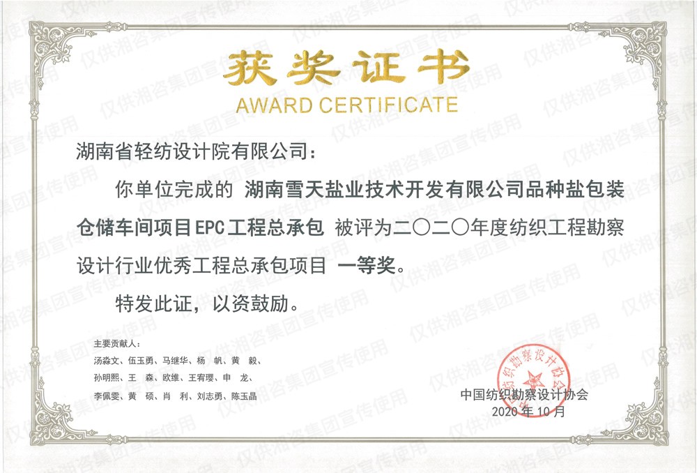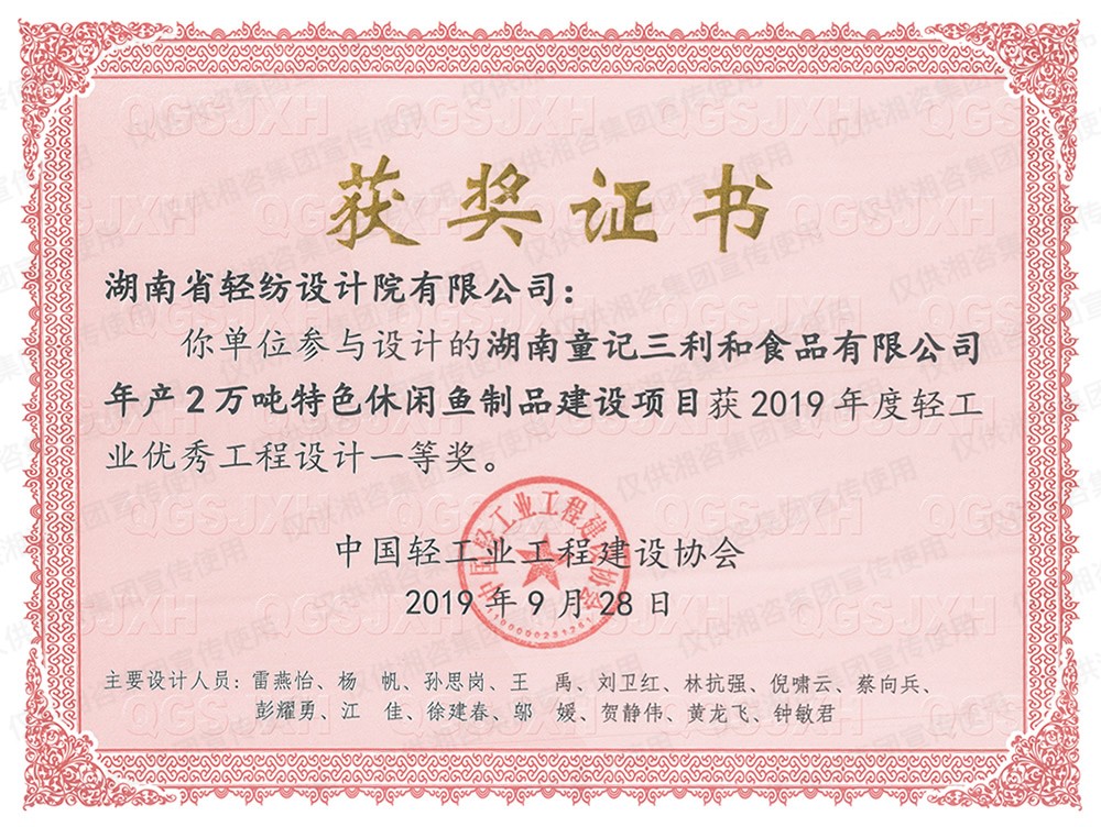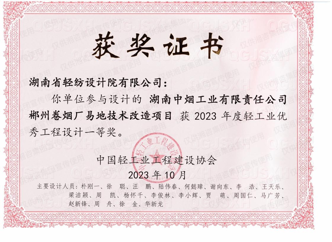 中國輕工業(yè)工程建設(shè)協(xié)會輕工業(yè)優(yōu)秀工程設(shè)計一等獎