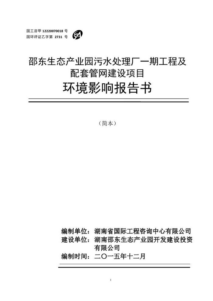 邵東生態(tài)產(chǎn)業(yè)園污水處理廠一期工程及配套管網(wǎng)建設(shè)項(xiàng)目環(huán)評報(bào)告書(簡本)