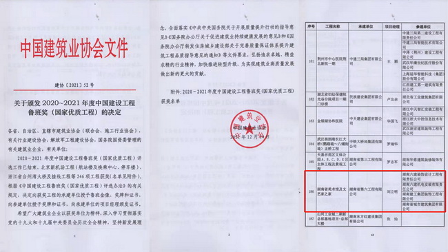 近日,中國(guó)建筑業(yè)協(xié)會(huì)公布“2020~2021年度中國(guó)建設(shè)工程魯班獎(jiǎng)(國(guó)家優(yōu)質(zhì)工程)獲獎(jiǎng)工程名單”,省咨詢公司代建的湖南省美術(shù)館項(xiàng)目、湖南文藝家之家項(xiàng)目、湖南美術(shù)館展陳裝修工程三個(gè)項(xiàng)目成功入選。據(jù)悉,這是公司代建項(xiàng)目首次榮膺此項(xiàng)殊榮,創(chuàng)造了公司代建工作新的歷史。