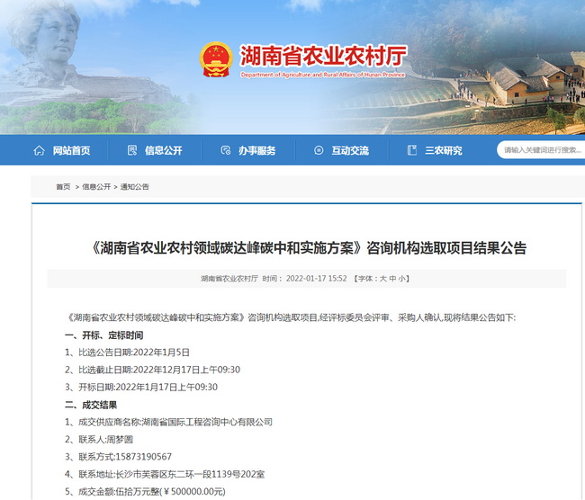 2022年1月17日,經(jīng)過與眾多投標單位的激烈角逐,省咨詢公司憑借豐富的咨詢經(jīng)驗、強大的技術(shù)團隊、過硬的成果質(zhì)量和完善的服務標準順利中標省農(nóng)業(yè)農(nóng)村廳《湖南省農(nóng)業(yè)農(nóng)村領(lǐng)域碳達峰碳中和實施方案》項目,項目中標金額為50萬元。