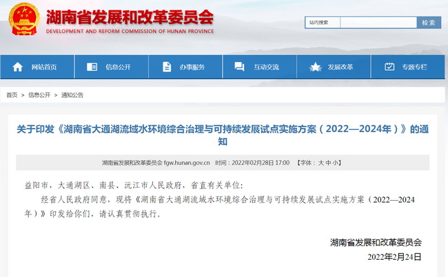 近日,按照國家發(fā)展改革委部署,經(jīng)湖南省政府同意,湖南省發(fā)展改革委近日印發(fā)了《湖南省大通湖流域水環(huán)境綜合治理與可持續(xù)發(fā)展試點實施方案(2022—2024年)》(下稱《實施方案》)。《實施方案》系省咨詢公司生態(tài)規(guī)劃咨詢部編制。