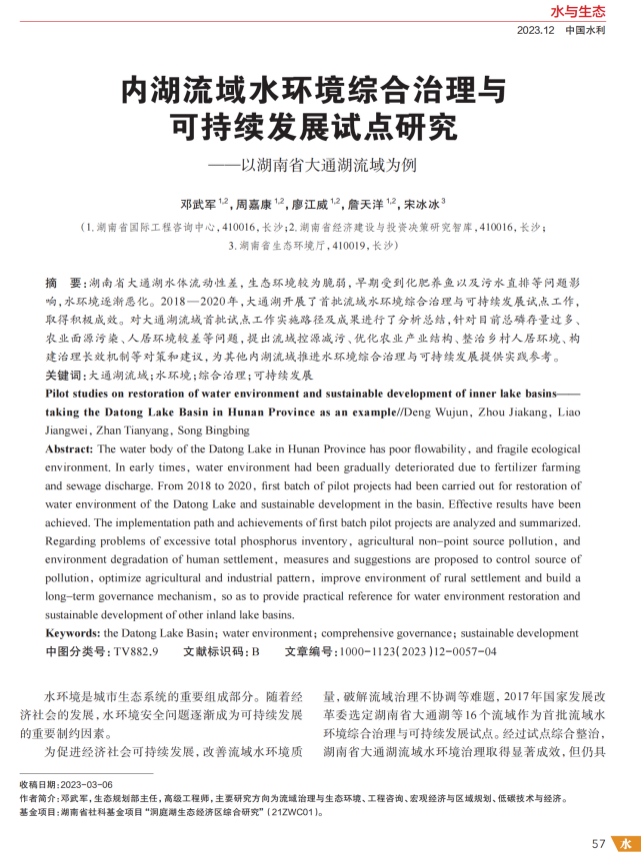 近日,由湘咨集團(tuán)生態(tài)規(guī)劃咨詢事業(yè)部撰寫的《內(nèi)湖流域水環(huán)境綜合治理與可持續(xù)發(fā)展試點(diǎn)研究—以湖南省大通湖流域?yàn)槔芬晃目l(fā)于《中國水利》2023年第12期,作者為該部門鄧武軍、周嘉康,廖江威,詹天洋。《中國水利》雜志是水利系統(tǒng)惟一的由水利部主管、主辦的綜合類科技期刊。期刊致力于探討水利發(fā)展對(duì)策,交流水利科學(xué)研究新進(jìn)展、推廣水利新技術(shù)、溝通水利與社會(huì)。
