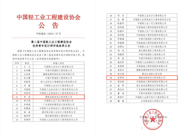 近日,中國(guó)輕工業(yè)工程建設(shè)協(xié)會(huì)正式公布了“第二屆中國(guó)輕工業(yè)工程建設(shè)協(xié)會(huì)優(yōu)秀青年設(shè)計(jì)師”評(píng)選結(jié)果,湘咨集團(tuán)所屬省輕紡院李浩、徐莎莎2名專家榮獲“第二屆中國(guó)輕工業(yè)工程建設(shè)協(xié)會(huì)優(yōu)秀青年設(shè)計(jì)師”榮譽(yù)稱號(hào)。
