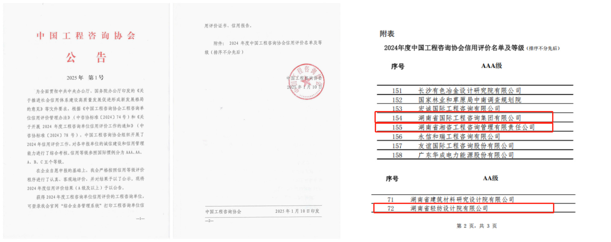 2025年1月10日,中國工程咨詢協(xié)會(下稱“中咨協(xié)”)發(fā)布2025年第1號公告,湘咨集團(tuán)成功獲評2024年工程咨詢單位信用評價(jià)等級AAA級。據(jù)省咨詢協(xié)會統(tǒng)計(jì),湖南此次共7家單位獲評AAA級,4家單位獲評AA級,其中,湘咨集團(tuán)獲評2家AAA級(本部及湘咨管理公司)、1家AA級(省輕紡院)。
