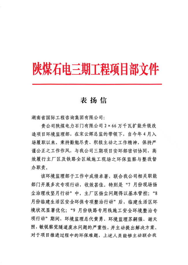 近日,由湘咨集團(tuán)環(huán)境保護(hù)咨詢事業(yè)部承接的陜煤石門(mén)電廠三期環(huán)境監(jiān)理項(xiàng)目收到建設(shè)單位發(fā)來(lái)的表?yè)P(yáng)信,來(lái)信對(duì)集團(tuán)監(jiān)理人員在項(xiàng)目建設(shè)階段的辛勤付出和卓越表現(xiàn)表示由衷······